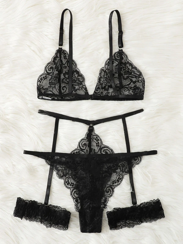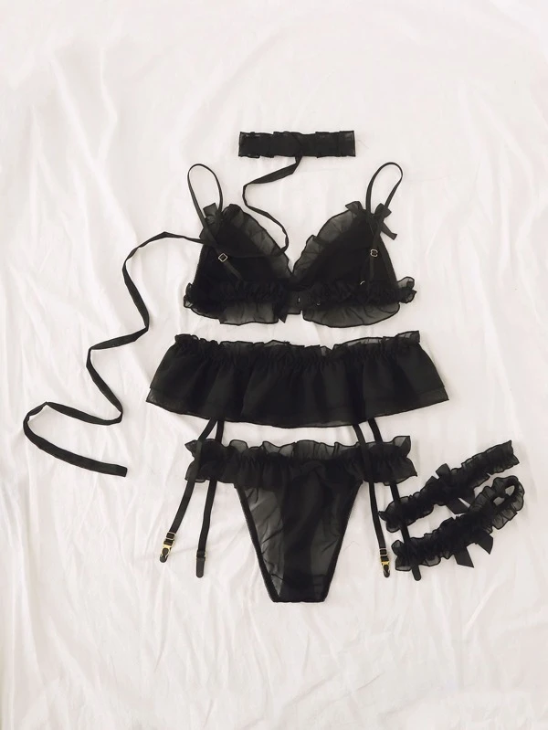 Black lingerie shein Clearance, Ruffle Trim Garter Lingerie Set With Clearance