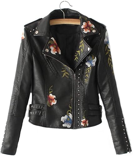 Flower embroidered leather jacket Clearance, DFGHN Floral Embroidery Faux Leather Clearance