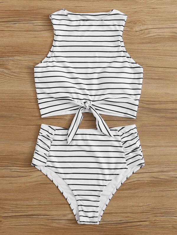 - Striped knot hem with ruched bikini