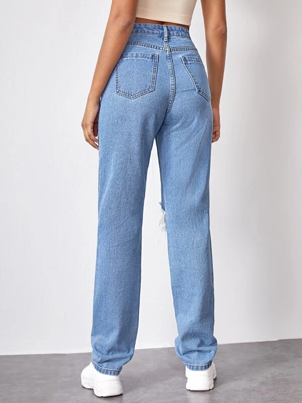 - High waist slant pocket ripped straight jeans free shipping