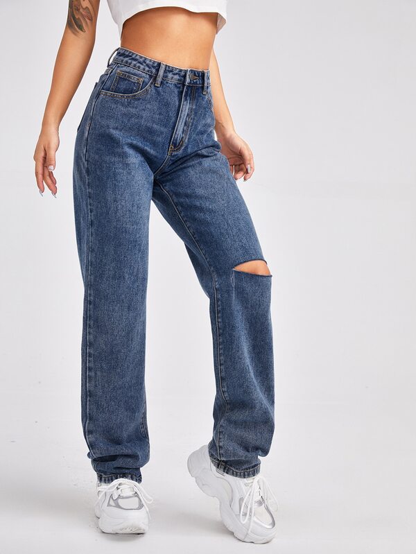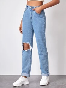 - Shopping High waist slant pocket ripped straight jeans