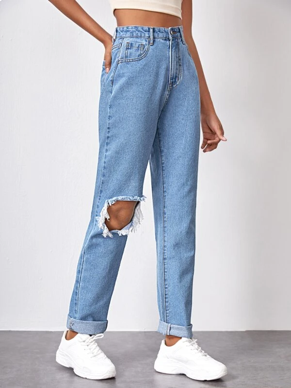 - Cheap High waist slant pocket ripped straight jeans
