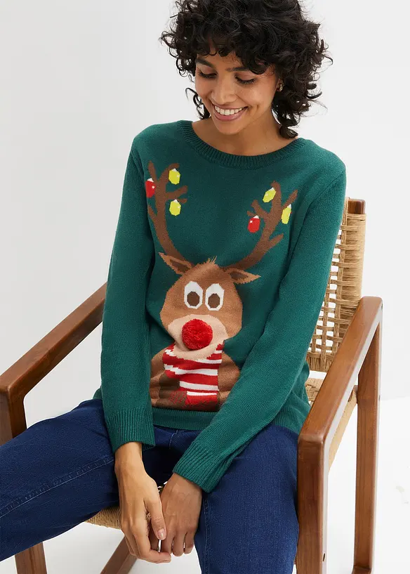 Bonprix damen weihnachtspullover Clearance, Weihnachtspullover mit Rentier-Motiv - grün - Damen | bonprix Clearance