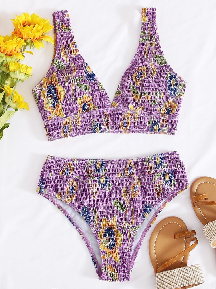 - Floral smocked high waisted bikini swimsuit outlet