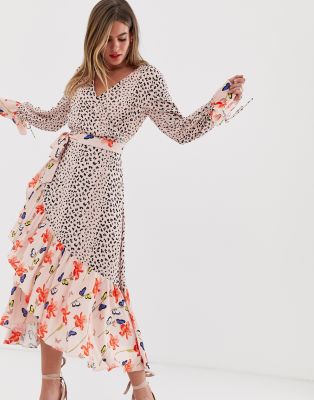 Dark pink wrap midi dress in mixed print Clearance