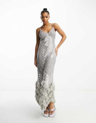Brautkleid in silber Clearance, Miss Selfridge – Premium – Verziertes Maxi-Brautkleid in Silber mit Kunstfederbesatz Clearance