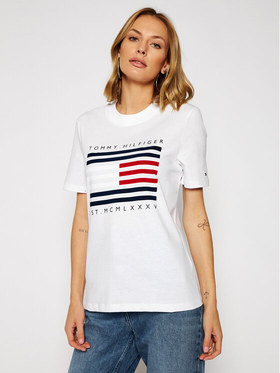 Ww0ww29362 Clearance, Женская белая футболка REGULAR C-NK FLOCK Tommy Hilfiger WW0WW29362 — MD-Fashion Clearance