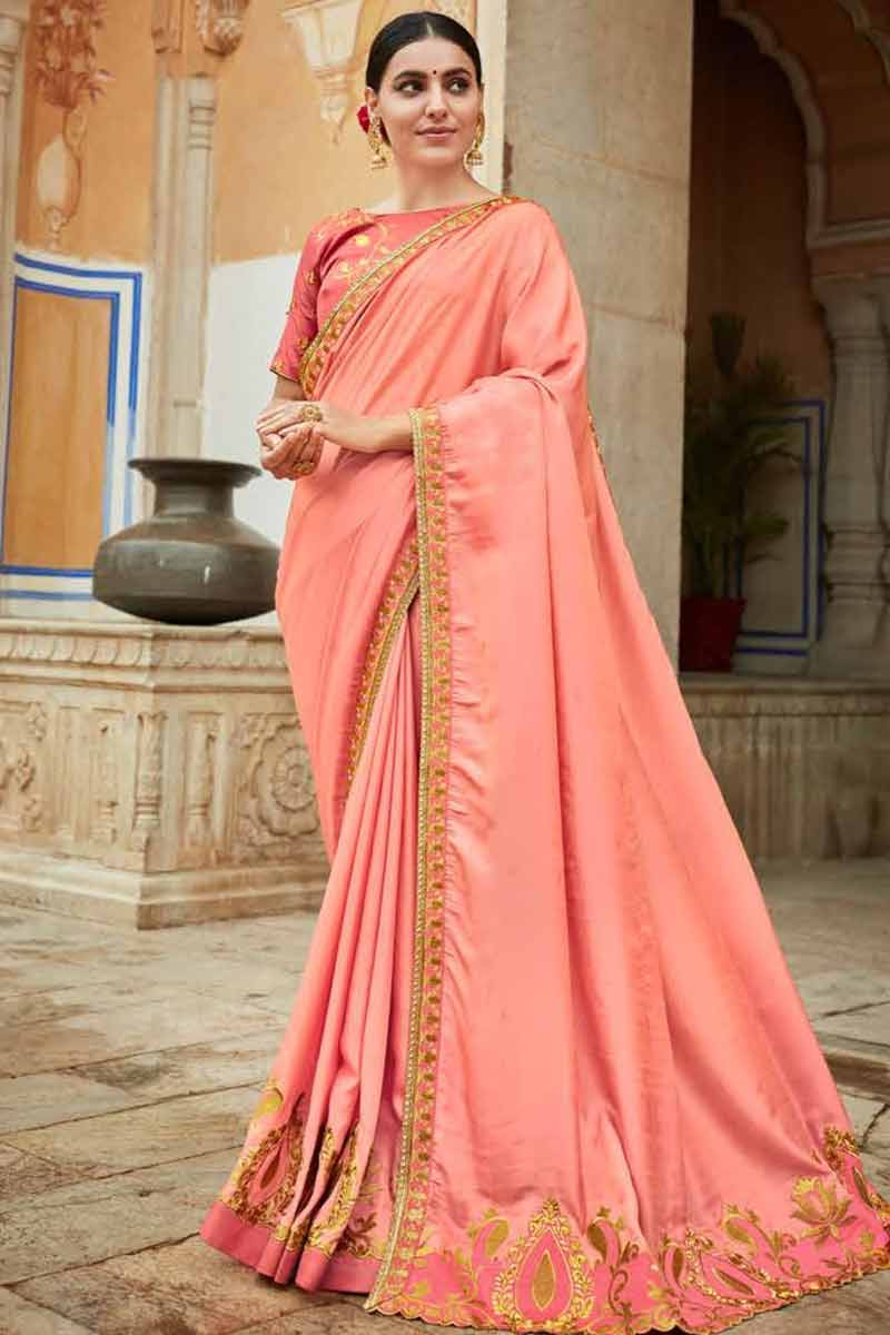 - Peach color silk saree with contrast blouse shop