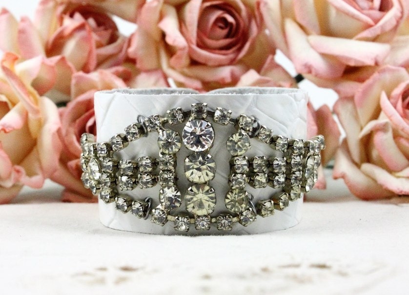 White leather cuff bracelet Clearance, Jeweled White Leather Cuff Bracelet featuring Vintage Clearance
