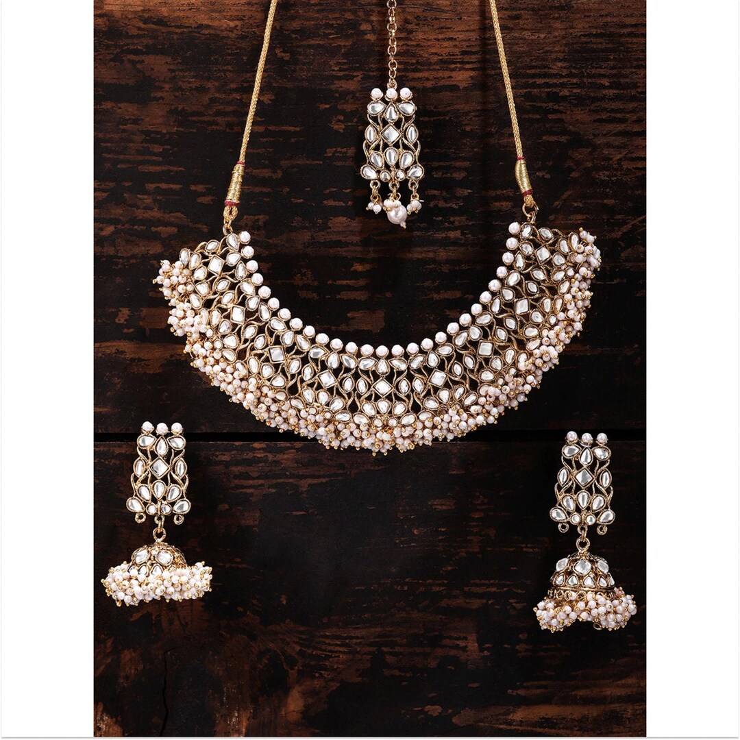 White kundan stones Clearance, Kundan Stones & White Pearls Choker Necklace With Jhumka Earrings and Maang Tikka Gold Plated Clearance