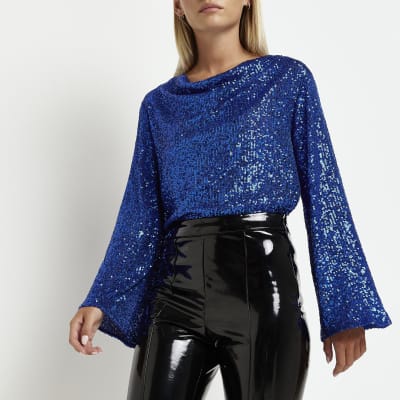 - Blue sequin long sleeve top sale online