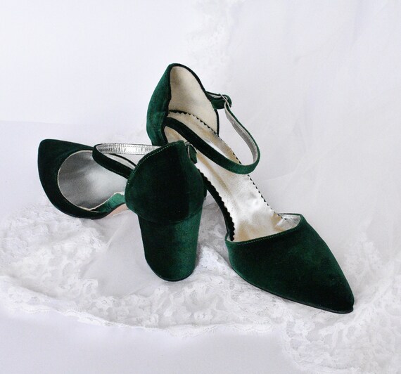 Deep green heels Clearance, Dark Green Velvet Block Heels Pointed Clearance