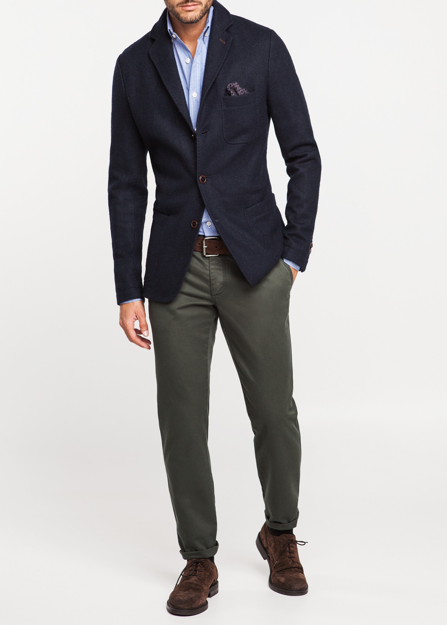 - Navy blazer with elbow patches