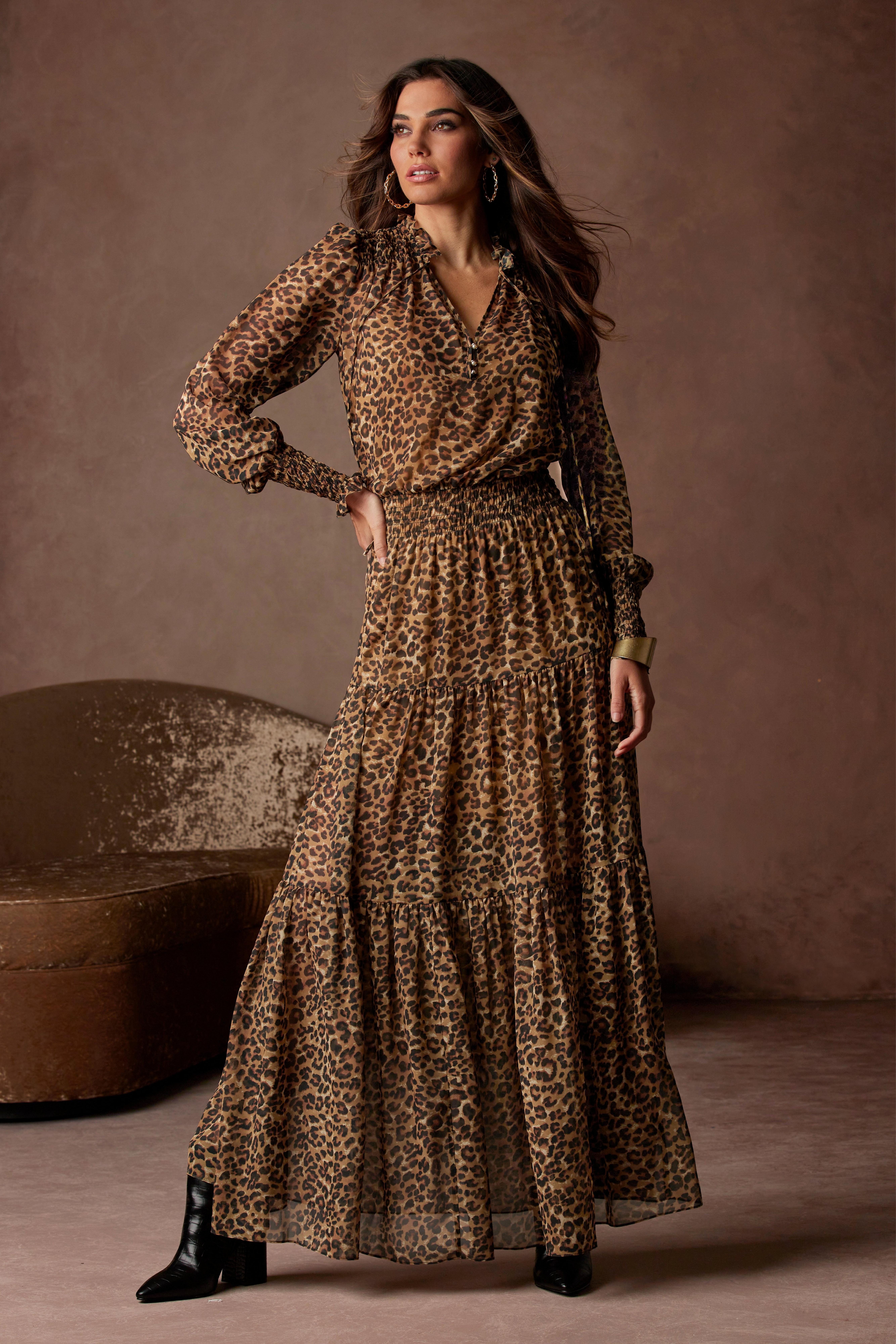Smocked long sleeve maxi dress Clearance, Long-sleeve Smocked Animal Print Maxi Clearance
