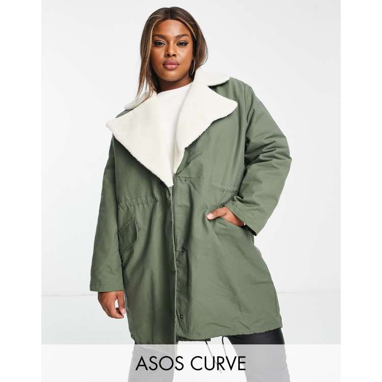 Asos parka jackets Clearance, ASOS DESIGN Curve quilt lined parka coat with sherpa collar in olive | ASOS Clearance