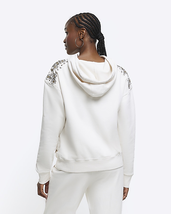 Embellished hoodie Clearance, Cream embellished hoodie | River Island Clearance